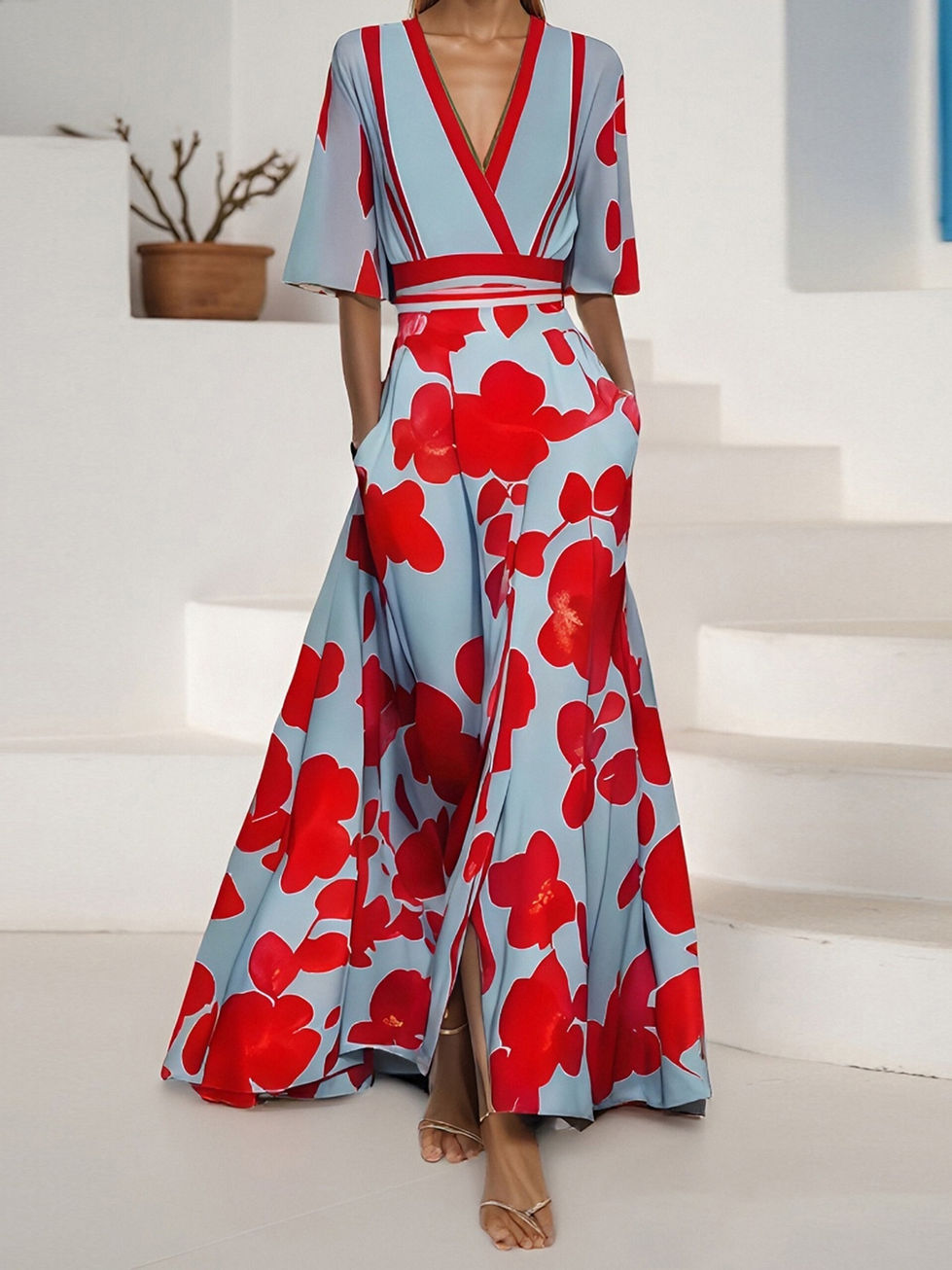 Women's Red & Blue Floral Print V-Neck Belted Dress